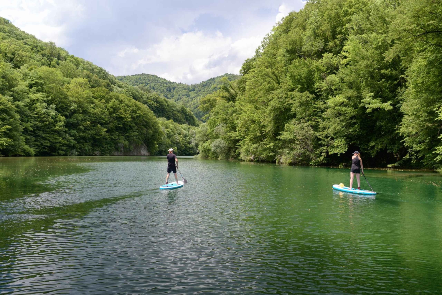 Vi begynner padleeventyret med å møtes på basen vår i sentrum av Bovec, der vi presenterer oss over en varm kopp kaffe. Når vi har blitt kjent med hverandre, gir vi deg alt utstyret du trenger for utflukten. Deretter hopper vi om bord i en komfortabel varebil og legger ut på en pittoresk reise sørover mot den vakre smaragdsjøen Most na Soči, hvor vi passerer de sjarmerende historiske byene Kobarid og Tolmin. Kjøreturen tar ca. 40 minutter og viser regionens fascinerende skjønnhet. Når vi ankommer innsjøen, setter vi opp brettene våre og gir en kort leksjon i padleteknikk. Vi begynner med det grunnleggende, starter på knærne og går gradvis over til stående stilling. Hvis du får problemer, hjelper vi deg helt til du finner balansen. Når alle er komfortable på brettene, starter vi turen over innsjøen og inn i den fascinerende Idrijščica-kløften. Idrijščica-kløften er et rolig og privat sted, langt fra turistmylderet, og er det perfekte stedet å padle. Vi vil være omgitt av vegger som reiser seg opptil 15 meter over oss, noe som gir oss en uforglemmelig og eksklusiv opplevelse. Underveis observerer vi det lokale dyrelivet, og kanskje får vi til og med sjansen til å hoppe i vannet fra klippene. Når vi kommer til enden av kløften, tar vi en pause på en vakker strand og nyter en liten matbit. Etter pausen fortsetter vi turen tilbake til utgangspunktet og kjører deretter tilbake til Bovec. Når vi er ferdige, har du lært å padle som en proff og skapt uforglemmelige minner som du kan dele med dine nærmeste. Vi setter vår ære i å sørge for at du nyter turen og husker dette magiske stedet for alltid.Includes