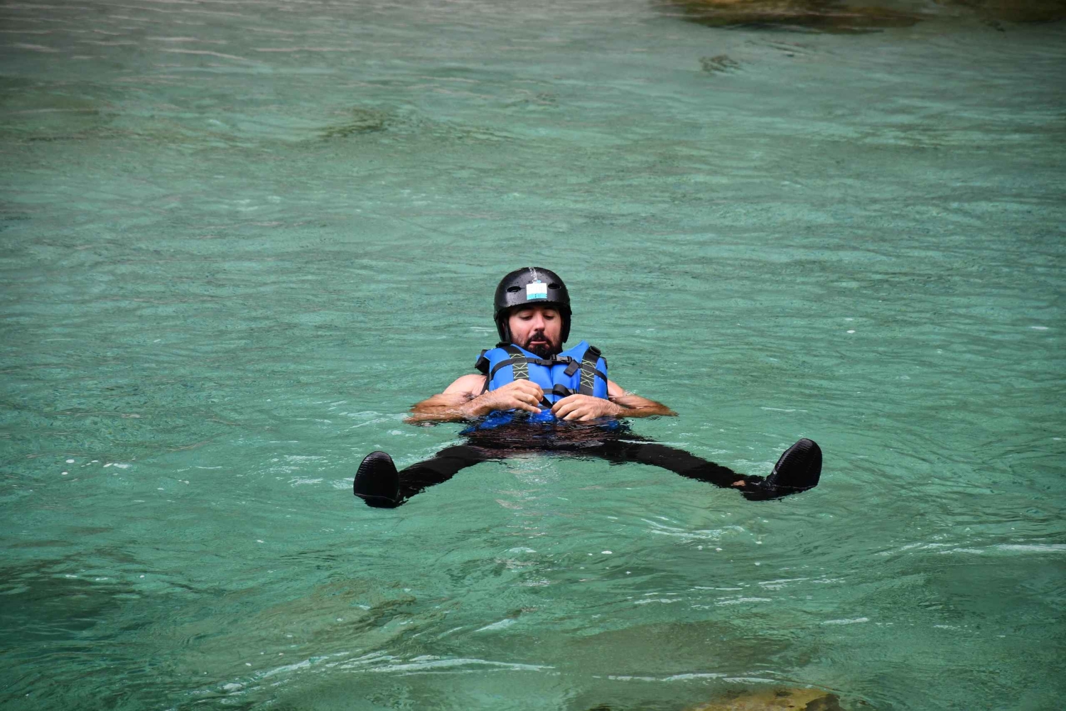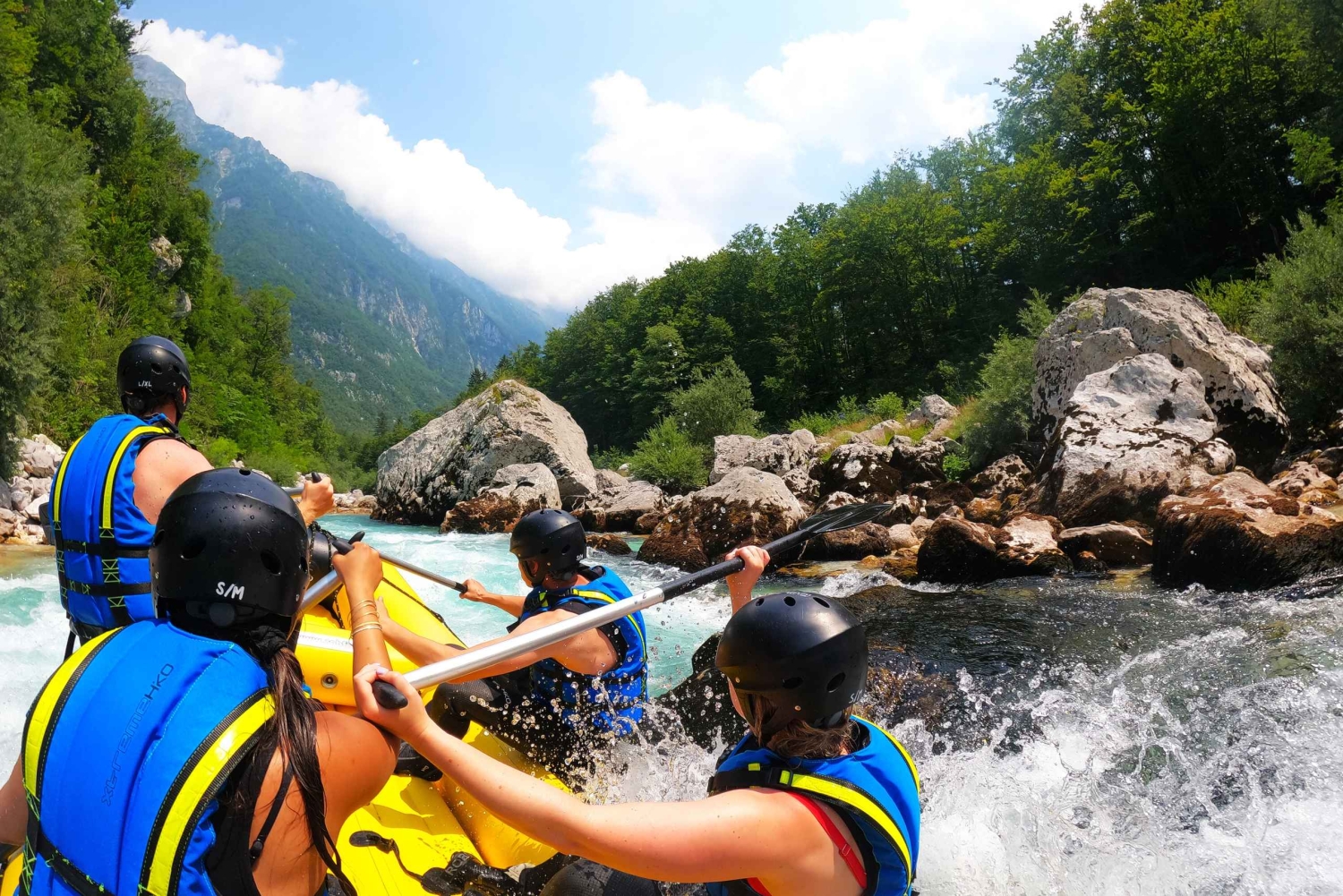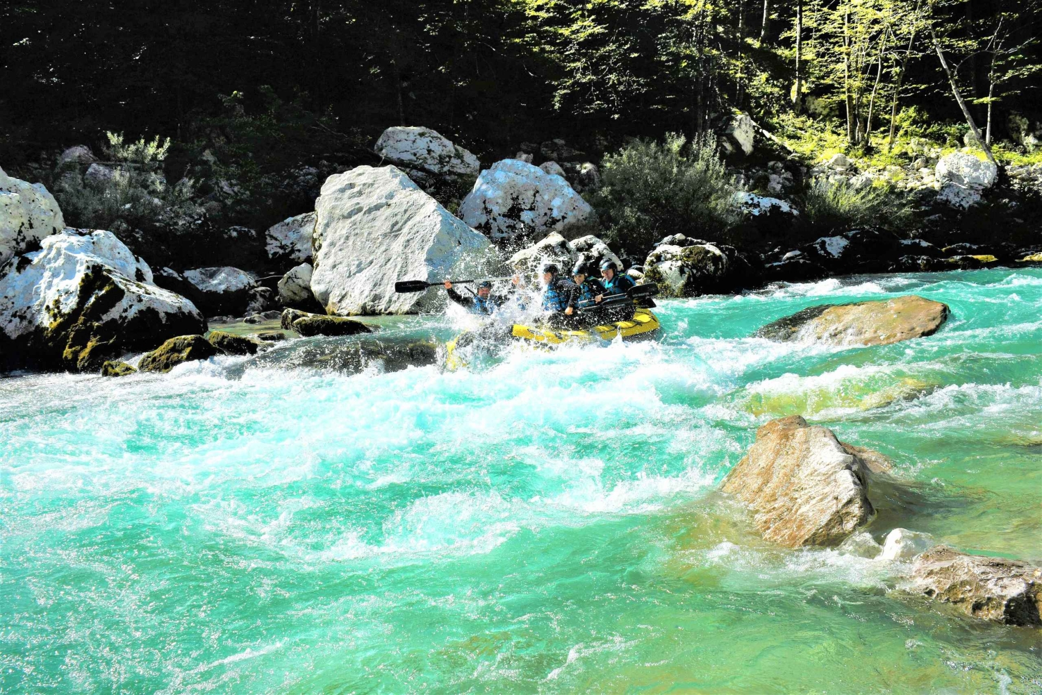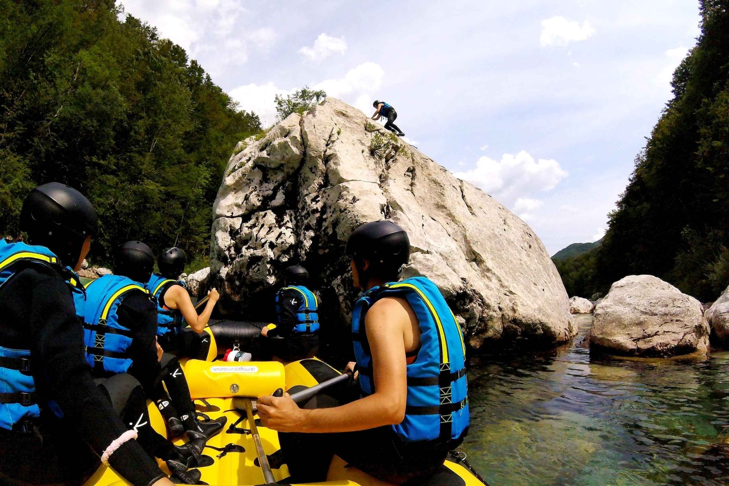 O rafting de aventura acontece na parte mais emocionante do rio Soča, que só é acessível por barco. Podes esperar uma divertida experiência aquática de 1,5 horas nas corredeiras do Soča, saltando em piscinas esmeraldas e nadando no Soča, que tem aproximadamente 10 °C. Para os nossos rafters mais corajosos, espera um salto de uma rocha de 7 m de altura, chamada 'rocha Manhattan'.